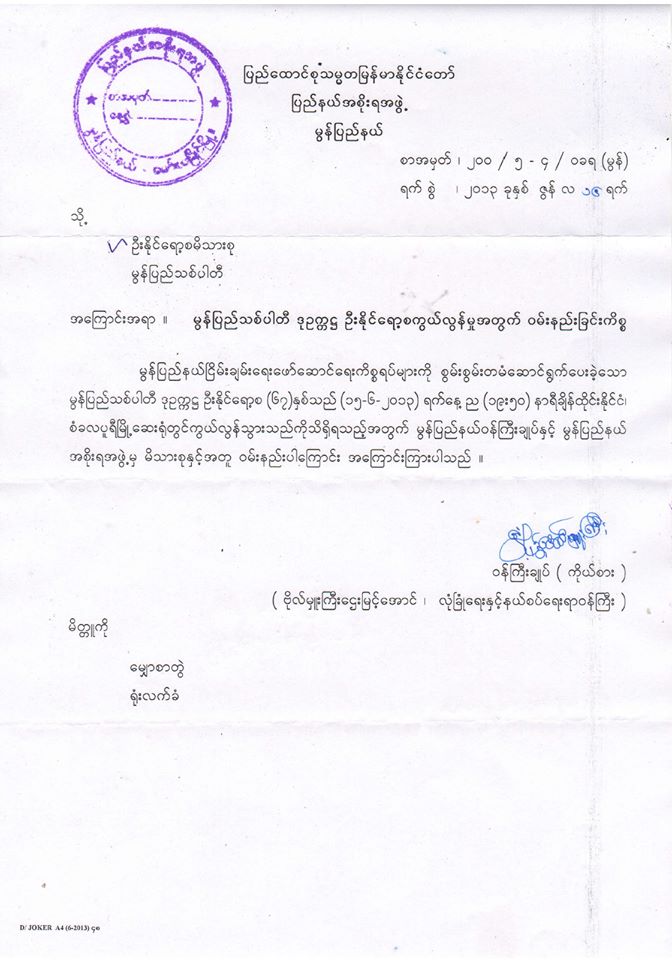 မွန်ဒီမိုကရေစီပါတီ MDP ၊မွန်ညီညွှတ်ရေးအဖွဲ့ MUL, မွန်ပြည်နယ်၊Mon Youth Friendship Network တို့၏ သဝဏ်လွှာပေးပို့ချက်များကိုလည်း လက်ခံရရှိခဲ့သည်။