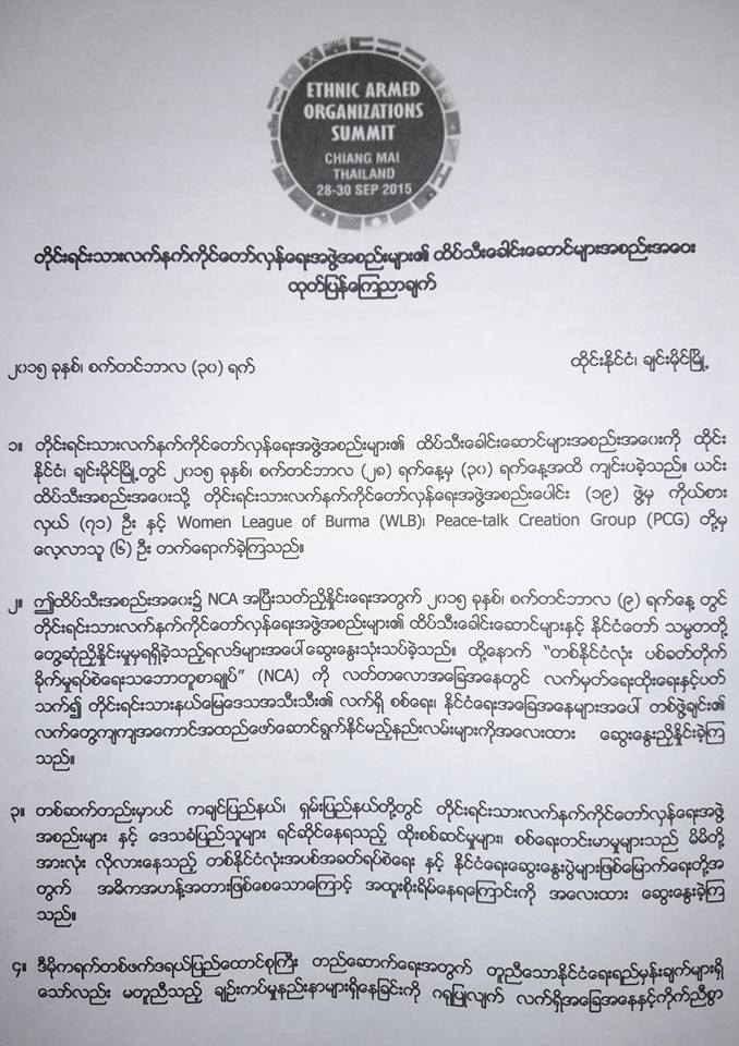 တစ်နိုင်ငံလုံးအပစ်အခတ်ရပ်စဲရေးစာချုပ်(NCA)လက်မှတ်ရေးထိုးခြင်း၊ မထိုးခြင်းနှင့်ပတ်သက်ပြီး တိုင်းရင်းသား လက်နက်ကိုင်အဖွဲ့ ထိပ်သီး ခေါင်းဆောင်များ အစည်းအဝေးကို စက်တင်ဘာ ၂၈ ရက်မှ ၃၀ ရက်နေ့အထိ ထိုင်း နိုင်ငံ၊ချင်းမိုင်မြို့၌ ပြုလုပ်ခဲ့ကြပြီးနောက် အထက်ပါ အတိုင်း တိုင်းရင်းသား လက်နက်ကိုင်အဖွဲ့ ခေါင်း ဆောင်များက ထုတ်ပြန်ကြေညာခဲ့ခြင်းဖြစ်သည်။