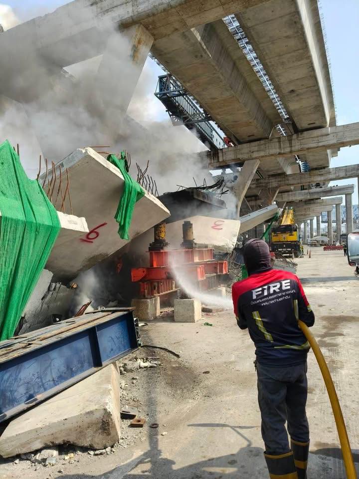 ထိုင်းနိုင်ငံ ရာမာ -၂ လမ်းမပေါ်ရှိ ဆောက်လုပ်ရေးကရိန်းပြိုကျသည့်နေရာတွင် မီးလောင်မှုဖြစ်ပွား