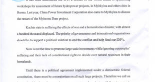 မြန်မာမြစ်ချောင်းများအပေါ်တွင် နိုင်ငံတကာငွေကြေးကော်ပိုရေးရှင်း IFC မှ ရေကာတာတည်ဆောက်ရန် ပြင် ဆင်နေခြင်းကြောင့် စစ်ပွဲများ ပိုမိုအရှိန်မြှင့်တက်စေမည့် IFC ၏ရေကာတာစီမံကိန်းများကို ပြည်သူအစိုးရမှ တားဆီးသင့်သည်ဟု ကချင်နိုင်ငံရေးပါတီများညှိနှိုင်းပူးပေါင်းဆောင်ရွက်ရေးကော်မတီ KPCC အထွေထွေ အတွင်းရေးမှူး တူးရော်က ပြောသည်။